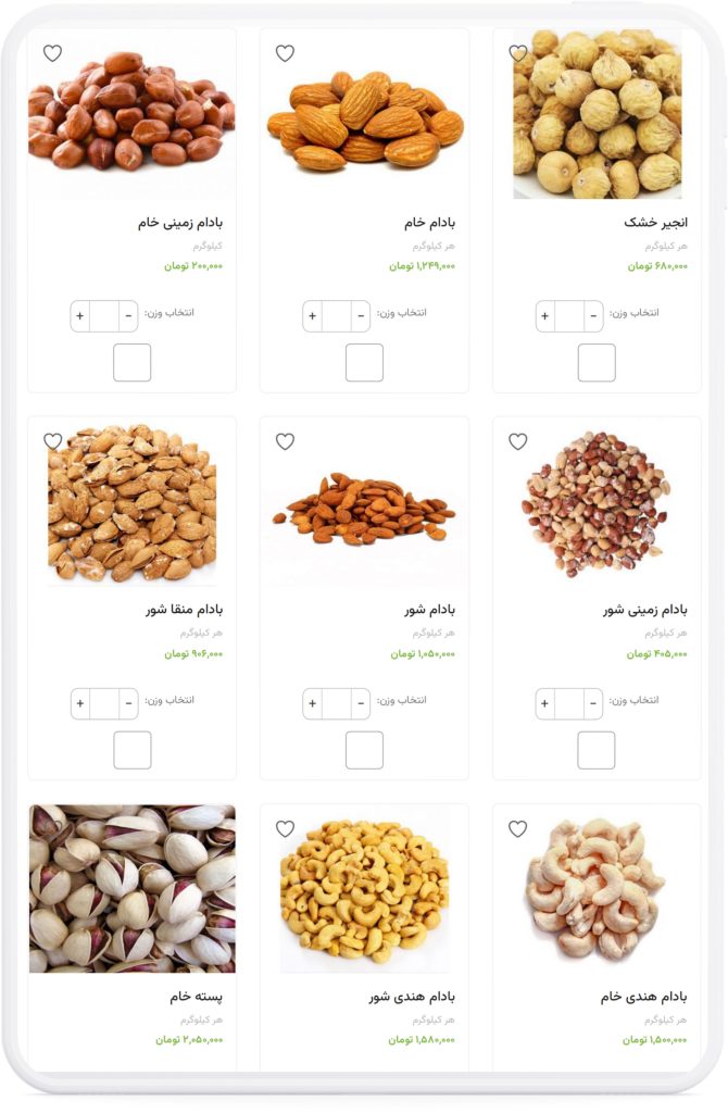 دسته بندی هوشمند محصولات: برای دسترسی سریع کاربران به انواع میوه، سبزی، آجیل و میوه خشک